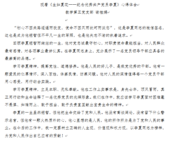 教学第五党支部积极贯彻落实校党委“不忘初心🧑🎓、牢记使命”主题教育领导小组办公室和省、市委组织部关于学习李夏同志先进事迹党员教育电视片《生如夏花》的通知👆🏽,支部组织全体党员利用手机🚚、电脑等渠道进行自学收看。