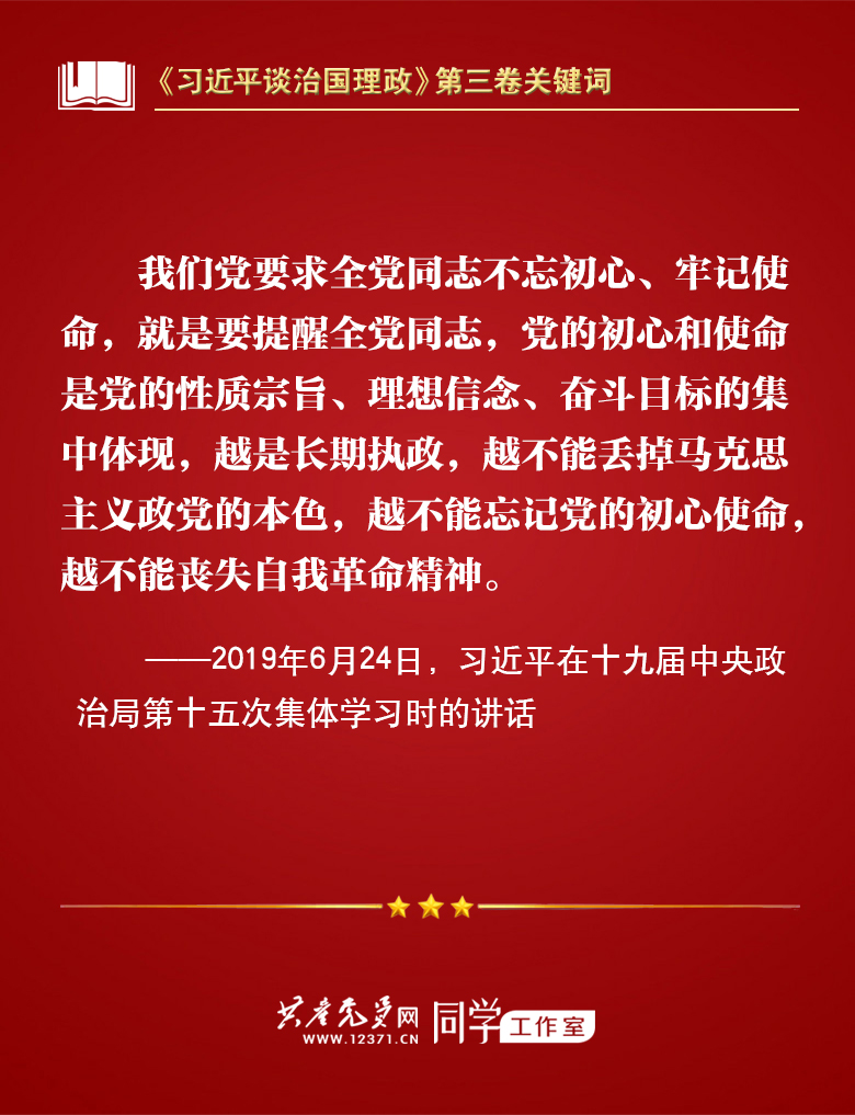 我们梳理习近平总书记部分讲话,带你学习著作中的关键词。今天的关键词是“不忘初心、牢记使命”。