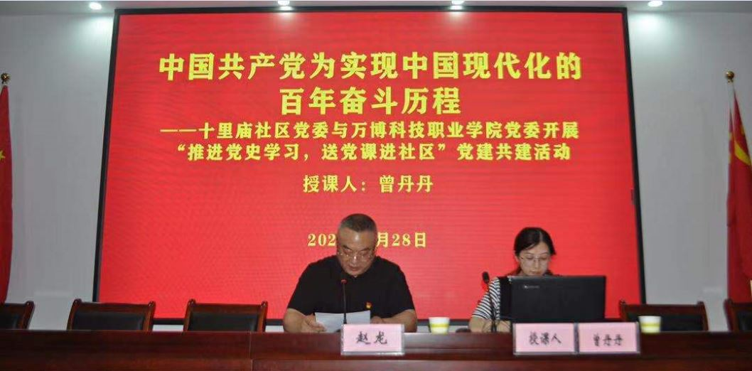 为庆祝中国共产党建党100周年🪆,推进党史学习教育🙋🏽♂️,2021年6月28日,彩神Vll学院党委携手十里庙社区党委🥝,于6月28日下午开展以“推进党史学习,送党课进社区”为主题的党建共建活动。活动由基础部党支部牵头落实,思政课党员教师曾丹丹授课。