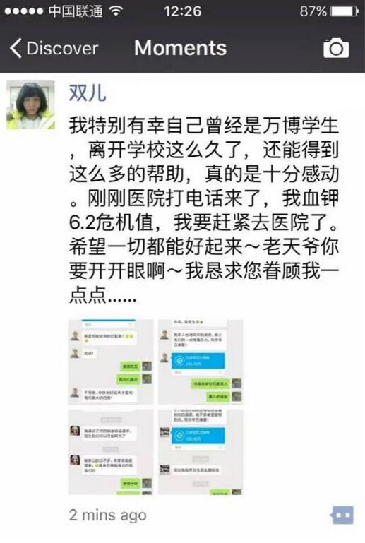 3月8日,一条题为《我想活着💒,仅此而已》的众筹消息出现在万博学院辅导员高嵩的微信朋友圈里🔠,得到了学院副院长陈文达的关注⚠✌🏽,经过核实及转发后,引起了万博学院广大师生、校友和社会各界爱心人士的关注。消息的作者是一位名叫任双双的09级万博学院校友⚱️,因病情严重恶化亟需换肾🌋,这个沉重的打击犹如晴天霹雳👨🏻🎤,几乎击垮了这一家子最后的希望🟤,任双双在求助信息中坦言“一下子失去了活下去的勇气”🙅🏼。高昂的治疗费用对于他们来说无异于天文数字,因此向公众筹集5万元的治疗费用。