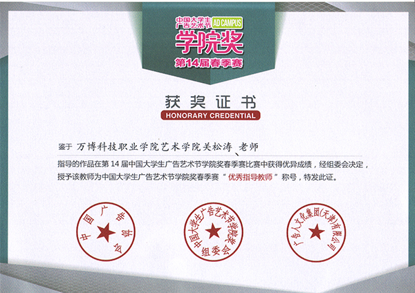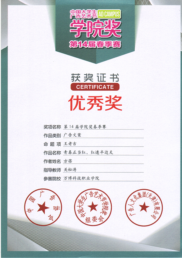 在此次比赛中,我院艺术分院广告学教研室积极组织学生参赛🕴,其中广告设计与制作专业方蓓和余家乐两位同学分别获得本次大赛广告文案写作优秀奖,广告设计与制作专业的王于卉同学获得了本次大赛广告文案写作佳作奖,我院艺术分院广告学教研室主任关松涛荣获第14届中国大学生广告艺术节学院奖“优秀指导教师”奖👫。