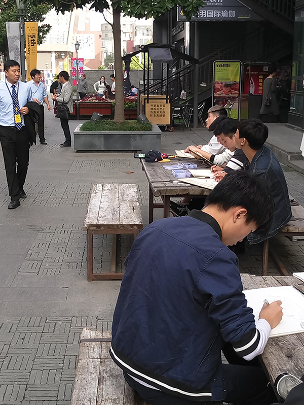 10月17日🏇🏻🦵,2015级室内设计班62位师生乘坐校车🫏,来到有着“城市的名片”美誉的 “1912”进行景观造型速写的写生课,在这个现代和传统风格并存的概念街区里,同学们拿起速写本、占有利角度🍮、寻找透视点,不一会儿马头墙、雕花门栏👭🕟、小资情调的餐厅就在寥寥数笔中呈现出来💫🕵️♂️。手绘课程需有完整的课程体系,线条、单体、小品的练习,到线稿👩🦰、色稿的临摹最后写生环节,训练室内专业学生的手绘创作能力,训练学生能提笔就画动手来操作软件的实战能力👨🏿🎨。