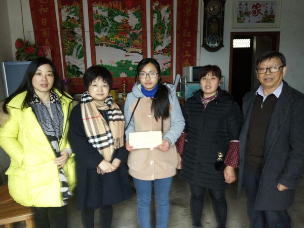 刘文慧副院长(左2)、理工分院院长苏仕华(右1)、学工部部长杨晓芸(左1)和受助贫困家庭合影