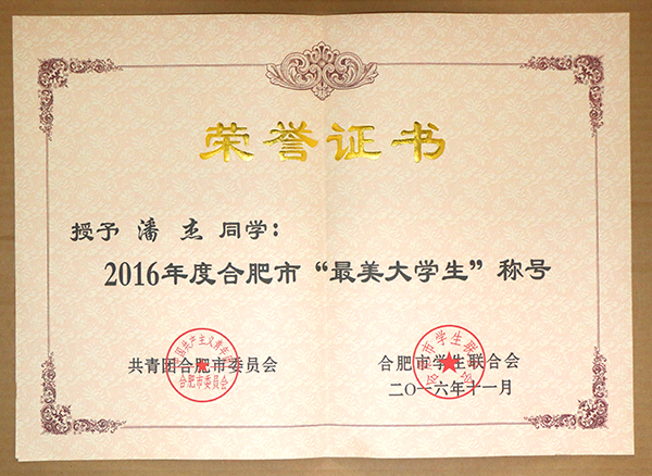 3月27日下午,由共青团合肥市委员会、合肥市学生联合会共同举办的2016年度“合肥市最美学生”暨第四届“合肥市十佳学生”颁奖仪式在四十二中举行。20名中学生、10名中职生、10名大学生成为“合肥市最美学生”,我院潘杰同学因大学期间表现优异、积极践行社会主义核心价值观在此次寻访评选活动中被授予合肥市“最美大学生”荣誉称号🧙🏻♂️。