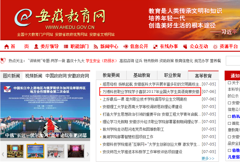 7月6日,安徽教育网首页发布题为《彩神Vll学院学子喜获2017年全国大学生英语竞赛安徽赛区一等奖》的报道,地址为7️⃣:http://www.ahedu.gov.cn/28/view/347371.shtml