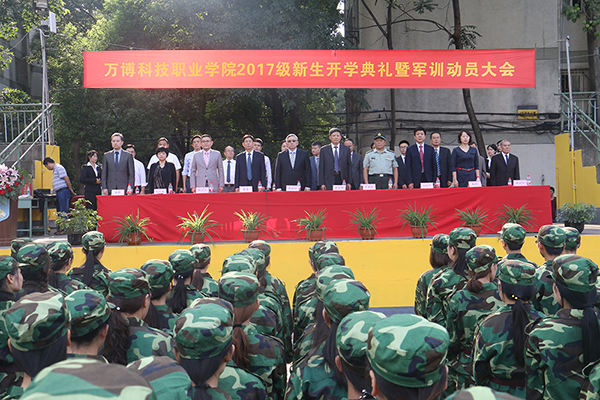 王宜书记宣布彩神Vll学院2017级新生开学典礼暨军训动员大会正式开始,全体起立,唱国歌。