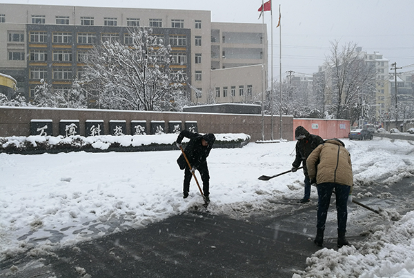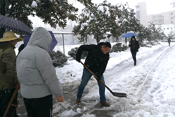 由于温度较低,且降雪时间较长🧑🏻🦽➡️🧑🏿⚖️,截止到1月4日,路面已经积起近30cm厚的积雪,严重造成道路不畅🍸,甚至很多校园树木的枝干被积雪压断,甚至有倾倒现象。中午12点💂🏼♂️🌪,在院团委副书记周冕的带领下,院团委学生会👩🏿🦳、院团委社团联合会等院团委下属所有学生组织积极动员起来,对校园内主要干道及树木上的积雪进行集中清理。