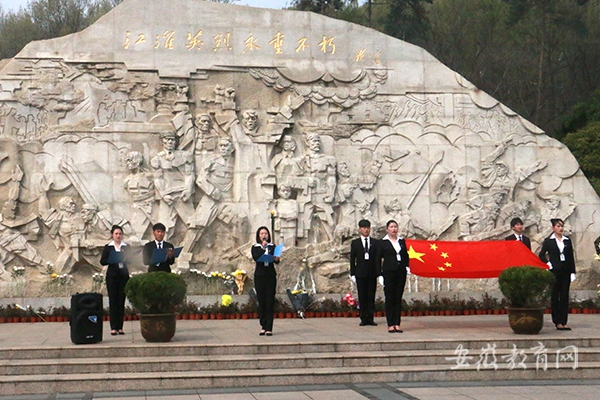 在邓小平同志题写的“江淮英雄永垂不朽”的英雄纪念碑前,同学们齐声高唱中华人民共和国国歌,迎接神圣的国旗,随后全体默哀一分钟⬇️,并由学生代表向英雄纪念碑敬献花束以表哀思〰️。