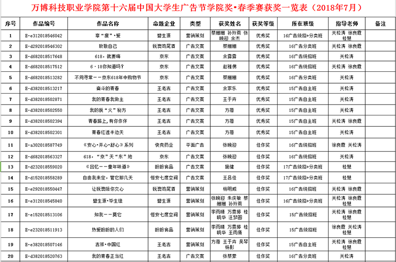 学院奖历经16届19年的发展,在中国广告创意界和教育界都引起极大的影响与关注👮♂️,在社会中形成了良好的反响和深远的影响,学院奖对于高校广告专业教育改革起到了积极的推进作用🏊🏼♂️,已经成为很多院校列在课表中的必修课🤦🏻。我院艺术分院广告设计与制作专业的全体师生在学院各级领导的大力支持下,从本届学院奖从2018年2月26日启动到4月30日上传参赛作品结束🐪,历经2个多月的时间💎,广告学教研室积极组织15级🧖🏼、16级和17级广告设计与制作专业的120余名学生积极参赛,最终创作并完成提交了参赛作品404件(系列),参赛类别包含广告文案、平面设计、营销策划案🧗🏿、微视频等参赛内容🧑🚀,作品数量和参赛类别均达到历年来参赛提交作品最多数量🌗,其中最多的一名学生个人提交作品数达到了53件👨🏽🎤。