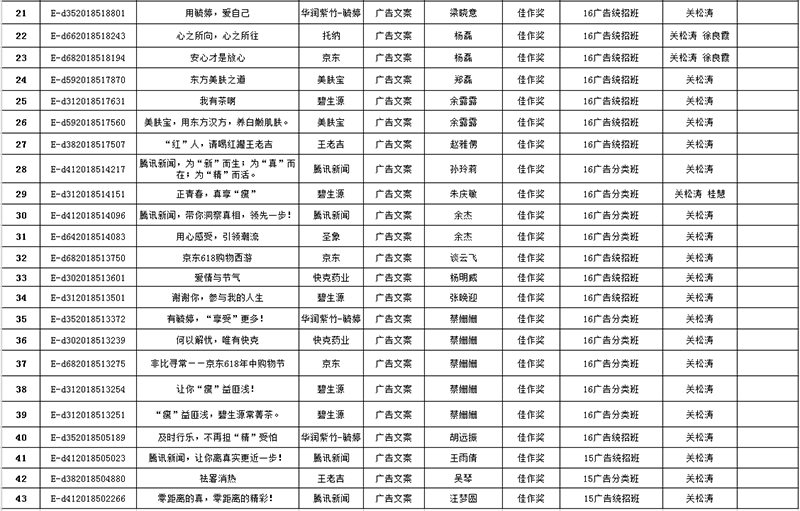 此次比赛,我院2015级广告设计与制作专业的方蓓🥵、余家乐和王于卉3名同学荣获5项优秀奖,2016级广告设计与制作专业的蔡珊珊、张皖迎、孙玲莉、余杰、余露露和赵雅侽6名同学荣获大赛的优秀奖5项;2015级广告设计与制作专业的汪梦圆、李雨晴🎅🏽、万雯婷、方蓓、桂晓华等10名同学,2016级广告设计与制作专业的张皖迎、杨明威📇、朱庆敏🏒、谈云飞等16名同学以及2017级广告设计与制作专业的施健和王吕佳2名同学,分别荣获春季赛佳作奖共33项。此外,艺术分院广告学教研室主任关松涛、专职教师徐良霞和桂慧分别荣获第16届中国大学生广告艺术节学院奖春季赛的优秀指导老师奖。