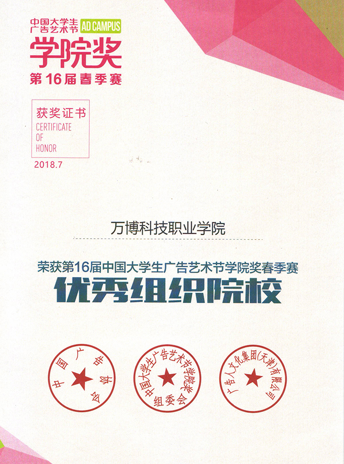 从2015年以来,我院艺术分院广告设计与制作专业的师生已连续积极组织参加中国大学生广告艺术节学院奖5届9次比赛📥,累计提交参赛作品2800余件🤯,累计获奖人数达200余人次🪐。我院在该项赛事中积极组织参赛,师生所取得的成绩不断突破🌴,受到组委会的表彰,并向我院颁发了第16届中国大学生广告艺术节学院奖(春季赛)“优秀组织院校”证书。