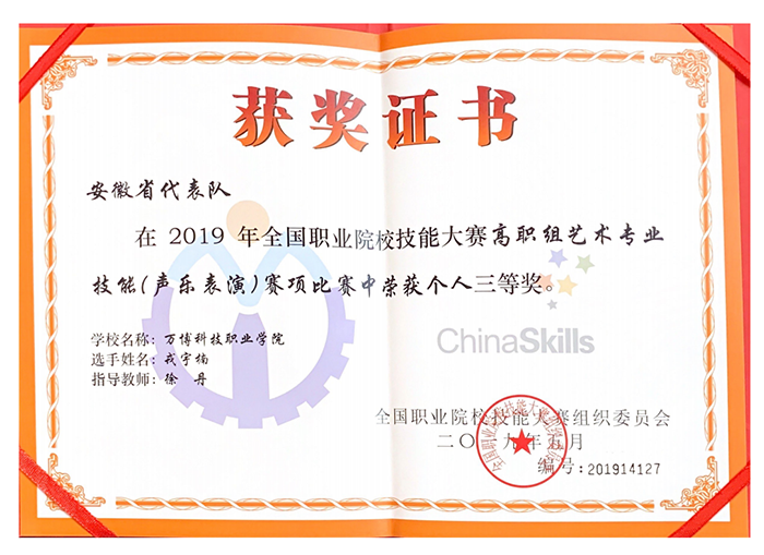 5月27-31日,2019年全国职业院校技能大赛高职组艺术专业技能(声乐表演)赛项在北京戏曲艺术职业学院成功举办,我院2016级音乐表演专业学生戎宇楠同学代表安徽省参加国赛,并取得个人三等奖的好成绩,实现了历史性的突破🧍🏻。