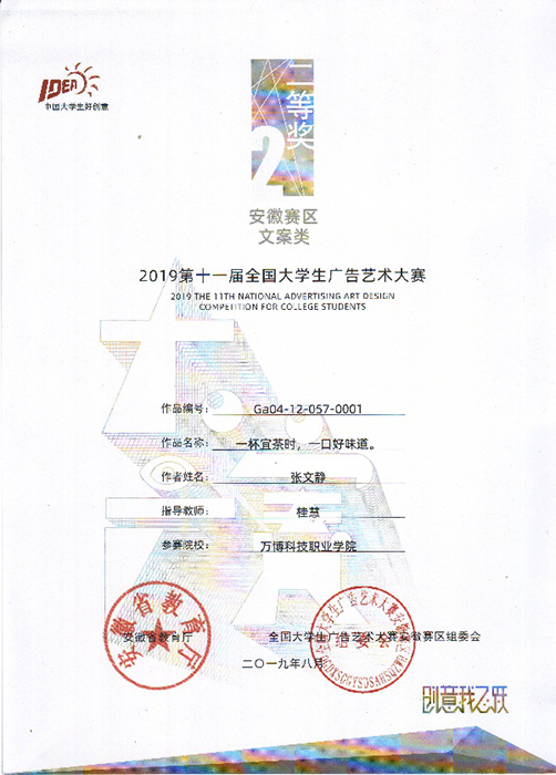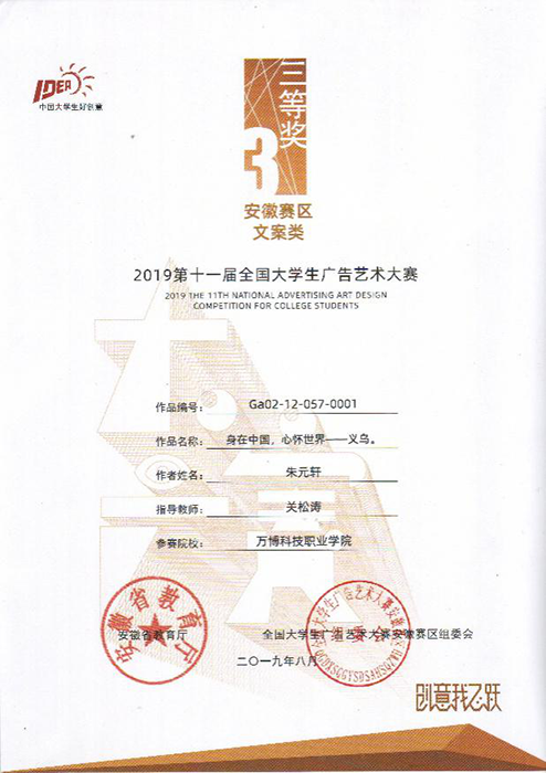其中,由艺术传媒学院广告传媒教研室专职教师桂慧指导的两个作品——18级广告班张文静同学创作的文案类作品《一杯宜茶时,一口好味道》荣获大赛二等奖🧑🏿🎓,18级广告班王婷同学创作的文案类作品《温暖的心意》荣获大赛三等奖🧝🏽♀️;广告传媒教研室主任关松涛指导的两个作品——17级广告班施健同学创作的平面类作品《轻薄柔滑》荣获大赛三等奖,18级广告班朱元轩同学创作的文案类作品《身在中国🐤,心怀世界——义乌》荣获大赛三等奖。