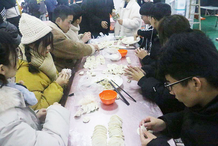 活动现场,师生齐动手,所有人分工有序,忙而不乱🪇。不一会儿,桌子上摆满了包好的饺子。大家有说有笑,沉浸在新年将至的节日氛围中。