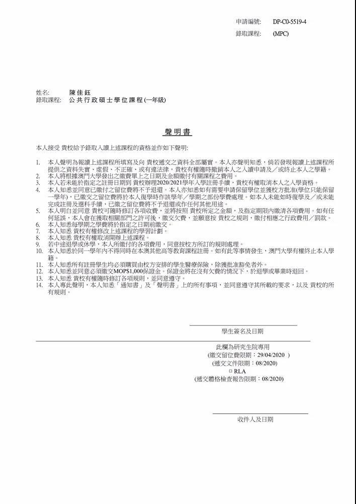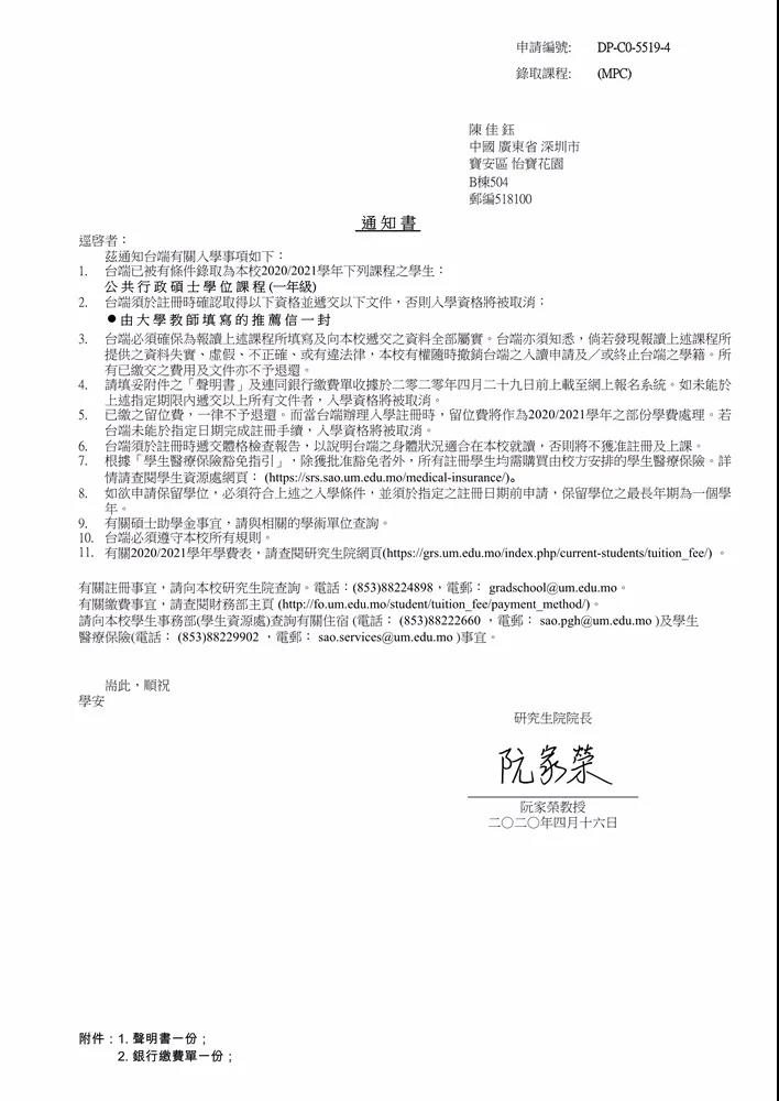 一边工作一边复习应考👬🏼,其艰难程度可想而知,除了上班👩🏼🍼,陈佳钰将业余时间都用在学习上。工作及学习的双重压力🦸🏻♂️,让她在一段时间内心力交瘁🧎♂️,几乎想要放弃🌝,但当初的目标仿若一盏明灯,在提醒她不能轻言失败。一次次的跌倒、爬起与坚持,一个人孤独而又漫长的4年时光👮🏻♂️,心血与汗水终于浇灌出了美丽的成功之花——2020年4月👶,陈佳钰收到了澳门大学的录取通知书🧝🏽!