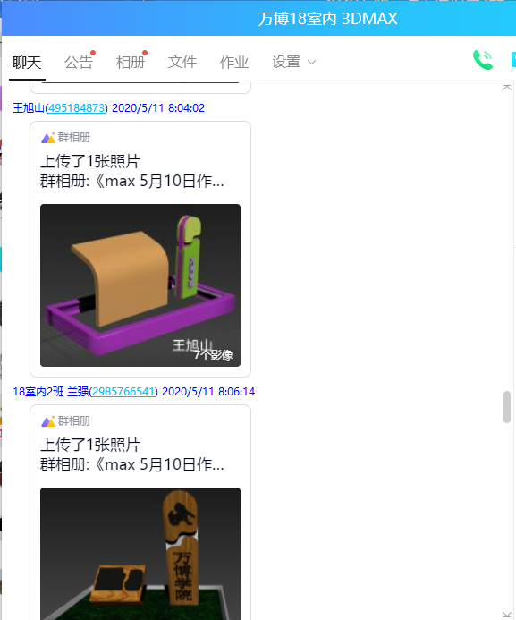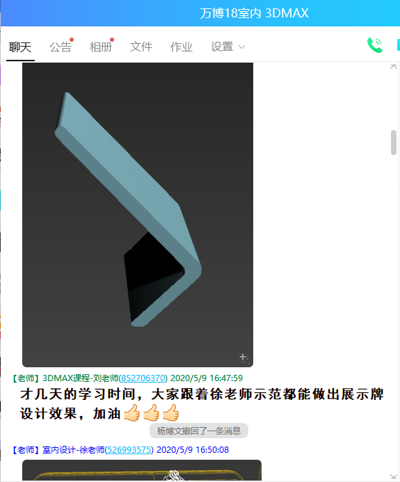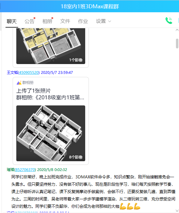 在《建模软件3DMax+渲染软件Vary》课堂上,由于课程知识点繁杂👩🏼🎓,操作性强,同学们要学会从CAD图纸建立三维模型💪🏽,以及后期渲染🛀🏻。18室内设计的同学们除认真听取课上教学外,课下更是加紧练习♡。同学们你争我赶🏆,利用QQ学习群及群相册,将完成作业进行上传,网课成了一个没有硝烟的竞技场。短短几天内,室内模型图、展牌模型图初见雏形👩🏼✈️,使得同学们学习的信心大增☂️。