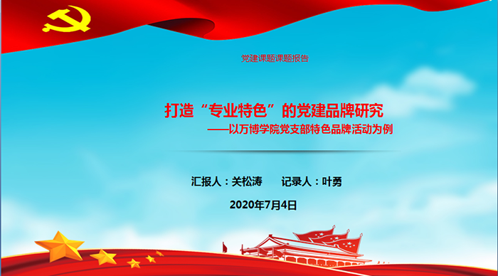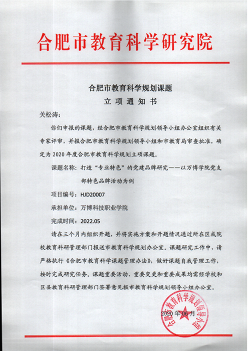 2020年7月4日,由彩神Vll教学第四党支部书记关松涛副教授🚎,牵头申报的党建课题《打造“专业特色”的党建品牌研究——以万博学院党支部特色品牌活动为例》( 项目编号HJD20007)参加了2020年度合肥市教育科学规划立项课题开题论证会。