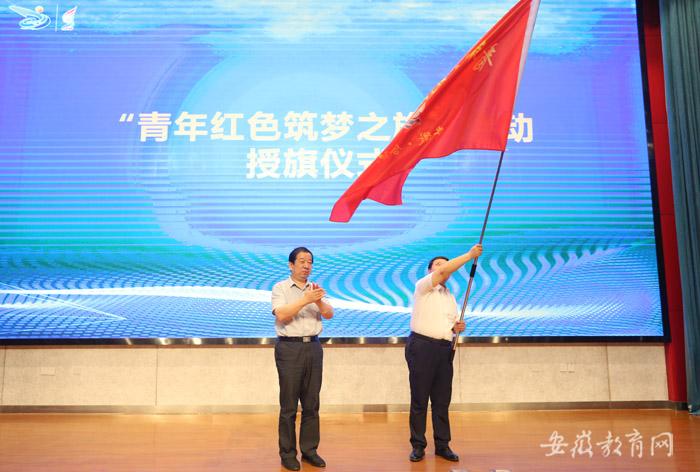 在“青年红色筑梦之旅”活动授旗仪式上🟩, 储常连将第六届”青年红色筑梦之旅“旗帜授予主办方之一的合肥工业大学副书记陈刚。
