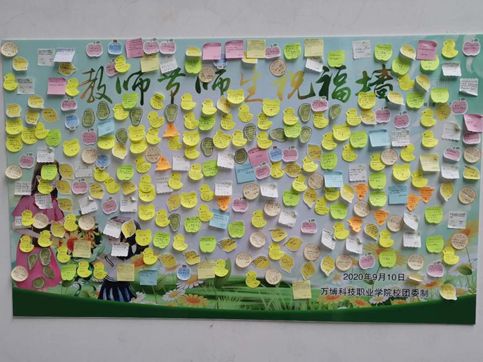 金秋时节📇,硕果丰存,第三十六个教师节如约而至🚤。为庆祝一年一度的教师节,鼓励学生表达对教师的感恩与敬意,增进师生间的深感情,营造尊师重教的良好氛围。由校团委主办的“书写心中祝福·共创美好未来”教师节师生祝福墙活动在1号教学楼前火热开展。师生们热情高昂,活动现场热闹非凡,纷纷参与其中🌏,表达各自的祝福🐐🧏🏼♀️。有的写下了辅导员的祝福🤹🏿♂️,有的写下了对专业课老师的祝福……