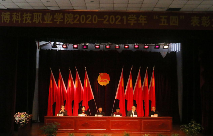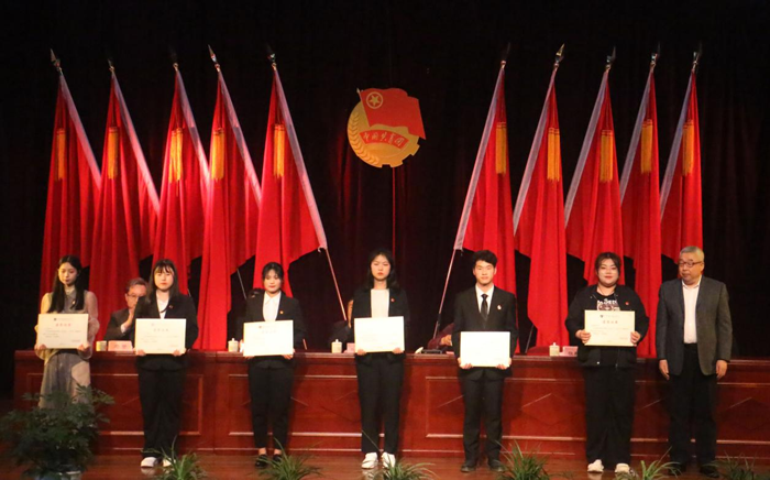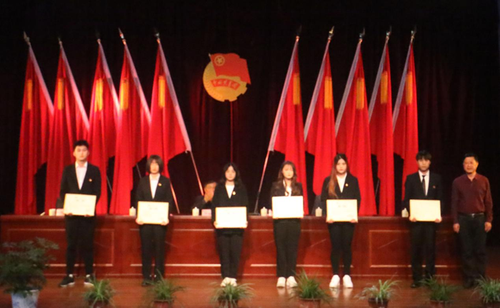(省教育厅督导专员、校党委书记汤增产为校五四红旗团总支部、优秀团总支部书记代表颁发荣誉证书)