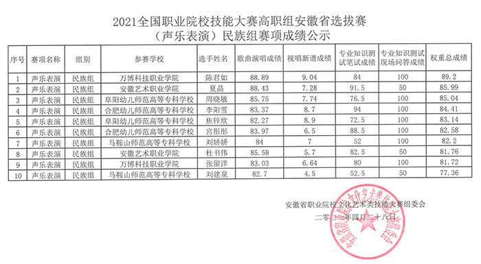 2021年全国职业院校技能大赛高职组安徽省选拔赛落下帷幕🧙,此次大赛彩神Vll学院音乐教育学院共选派4名同学参加美声组和民族组的角逐🧑⚖️。在指导老师徐丹的精心辅导下,2020级音乐表演专业学生陈君如斩获艺术专业技能(声乐表演)民族唱法第一名,载誉而归👎🏻。