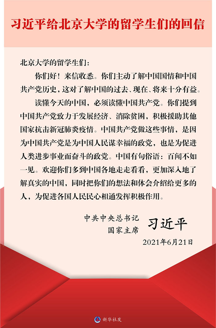 近日,来自32个国家的45名北京大学留学生代表给习近平写信,向中国共产党百年华诞致以美好的祝福🚴🏻♀️。来信讲述了他们在中国学习生活的体会感悟,表达了对在中国共产党坚强领导下中国取得伟大成就的由衷赞许,对中国共产党以人民为中心发展思想的高度认同✫。