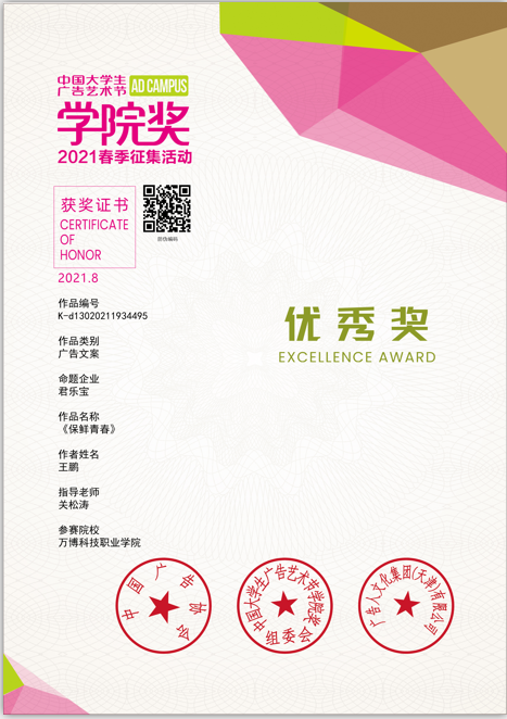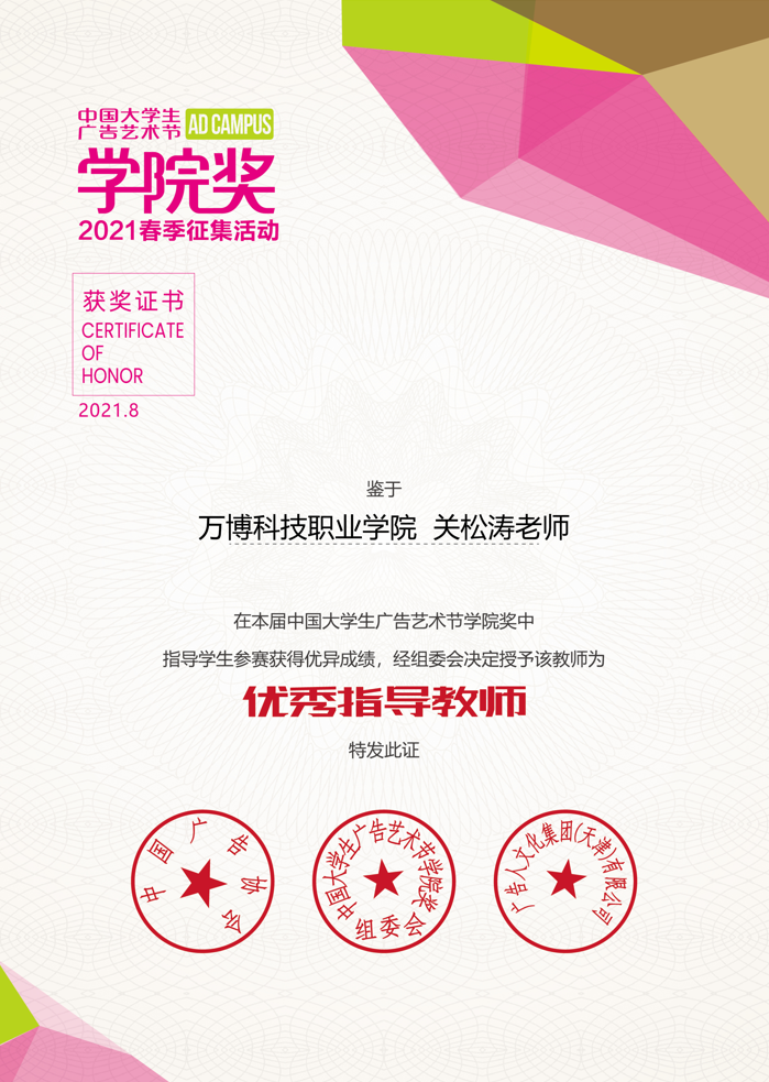 日前,在创意星球官方网站上公布的2021年第二十届中国大学生广告艺术节学院奖•秋季赛和创青春中国青年公益创意大赛这一赛事两项比赛的获奖信息中获悉😜,彩神Vll艺术传媒学院师生共获得优秀奖39项,入围奖62项🚴🏿♂️,优秀指导教师3人。