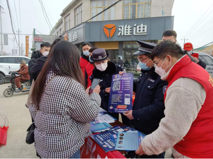 2021年1月8日,学生们寒假的第一天,彩神Vll“冬日暖阳”实践服务队灵璧籍多名学生队员早早出发前往灵璧县虞姬镇八岔路集市,在当地民警同志们的带领下,开展反电诈活动宣传。