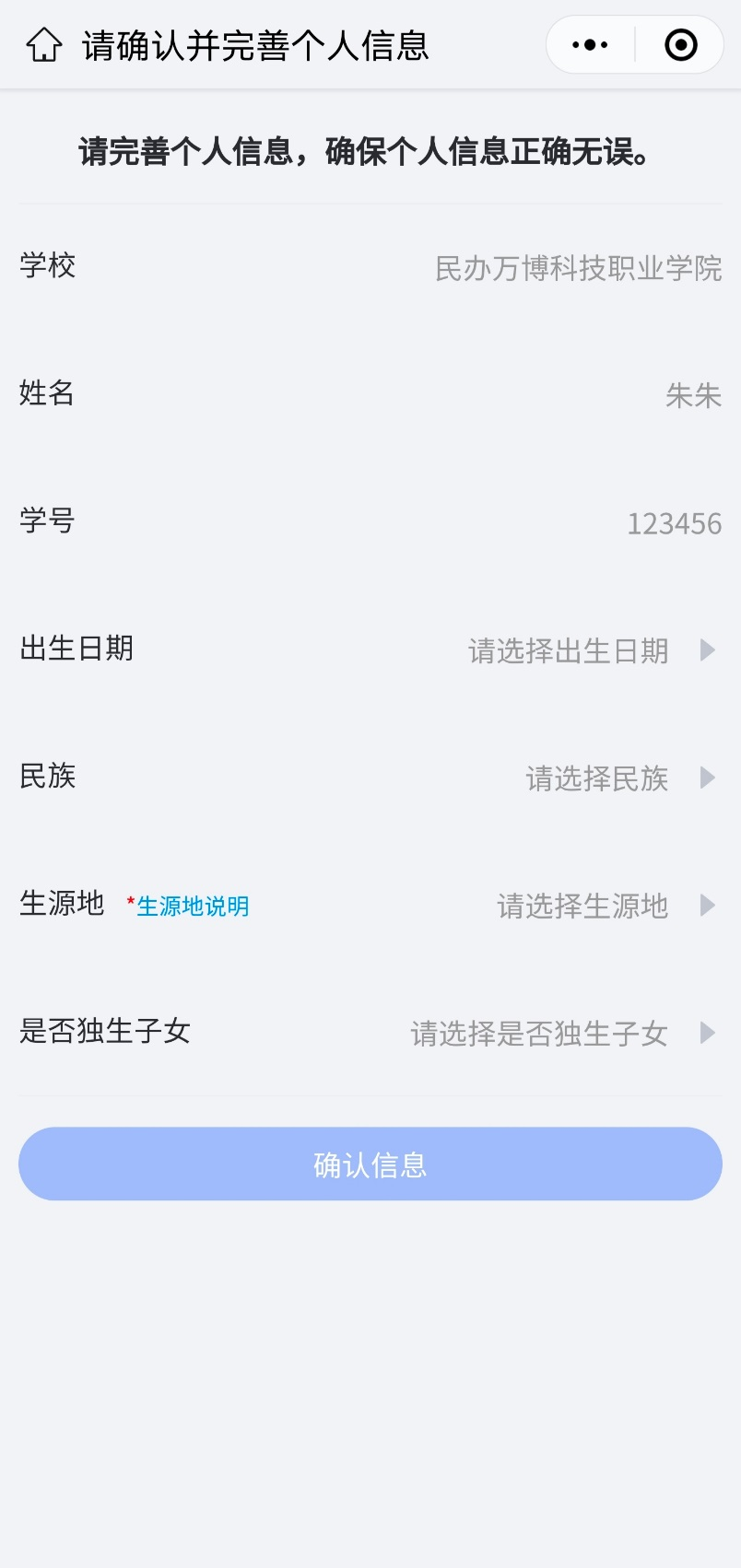 第三步:完善个人信息,点击“确认信息”,进入测试界面