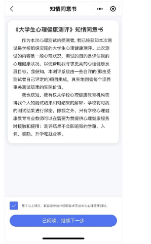 第五步🎤:点击“开始测评”,阅读“知情同意书”,勾选“基于以上情况👩🏼🍳,我自愿参加并按照要求完成本次心理健康测试”🦸♀️,点击“已阅读,继续下一步”🚴。