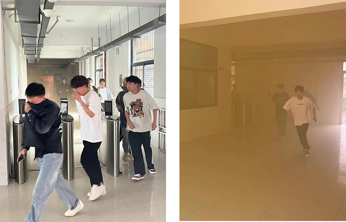 本次演练分为知识讲解和演练实战两部分。演练前,保卫部消防专员讲解了消防安全知识及安全逃生路线。下午13时30分,演练活动正式拉开帷幕🛍️。“火情”突发👱🏼,浓烟漫漫,刺鼻气味扑面而来,各楼层学生紧张有序地从宿舍楼👨🏻🤳、教学楼疏散到运动场、篮球场🍐,各二级学院辅导员🦶🏻、负责人迅速赶到学生宿舍,配合疏散学生,引导学生有序撤离,避免拥挤❎✒️。参训同学听从指挥,按照预定逃生路线🪕👃,低头、俯身👱🏻♀️,用手🪞、袖捂住口鼻向安全地点疏散👡。