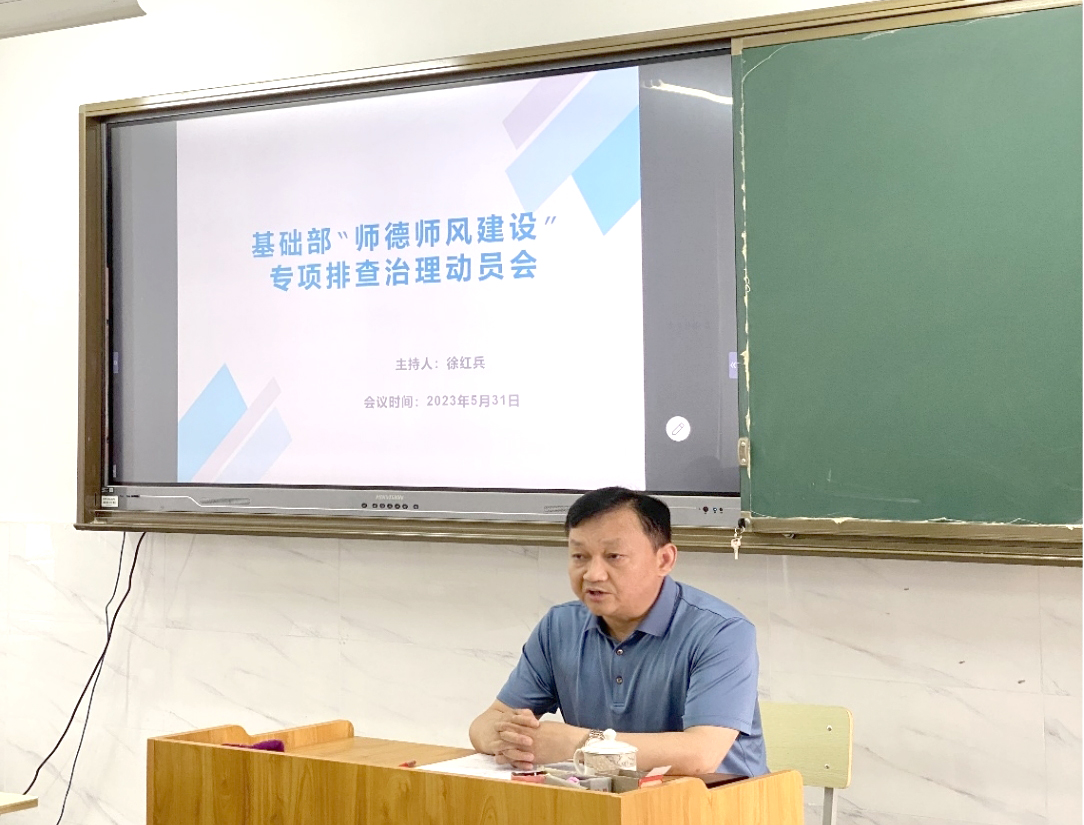 为深入贯彻落实进一步加强新时代教师队伍建设,进一步规范教师从教行为,努力建设一支“有理想信念、有道德情操、有扎实学识、有仁爱之心”的教师队伍🪂,按照学校师德师风建设工作领导小组要求,基础部于5月31日下午在1505教室召开师德师风建设专项排查治理工作动员会🥨。基础部全体教职人员参加会议🫳🏼,会议由基础部负责人徐红兵主持。