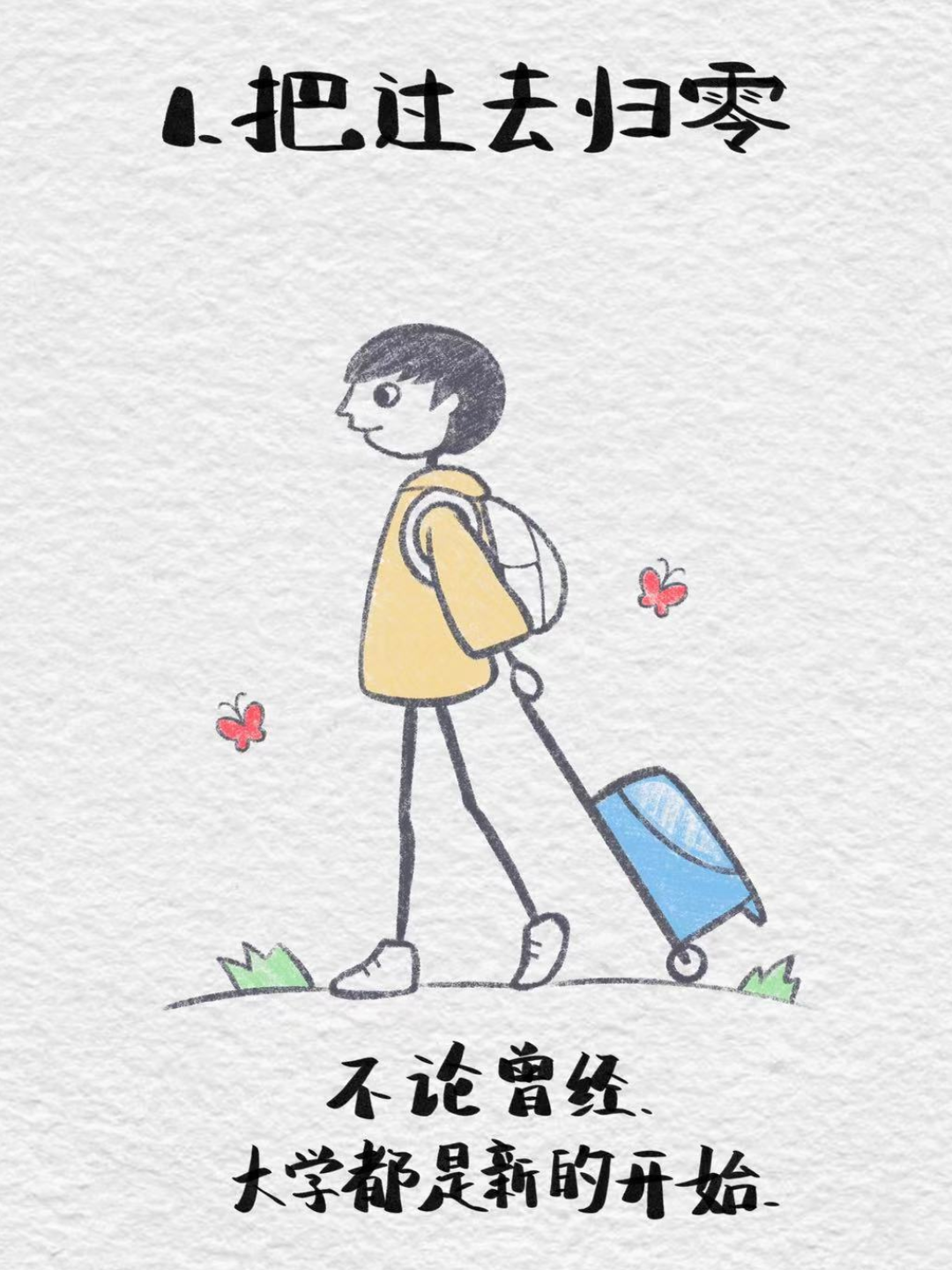 1.把过去归零。不管过去的你多么优秀,抑或是能力一般,那都是过去,上大学后记得把过去归零,一切重新开始。不要把过去的优越感带到学校,也许这里的每一个人都比你优秀🤓,但也不要自怨自艾,你可以好好通过大学提升自己,实现弯道超车。