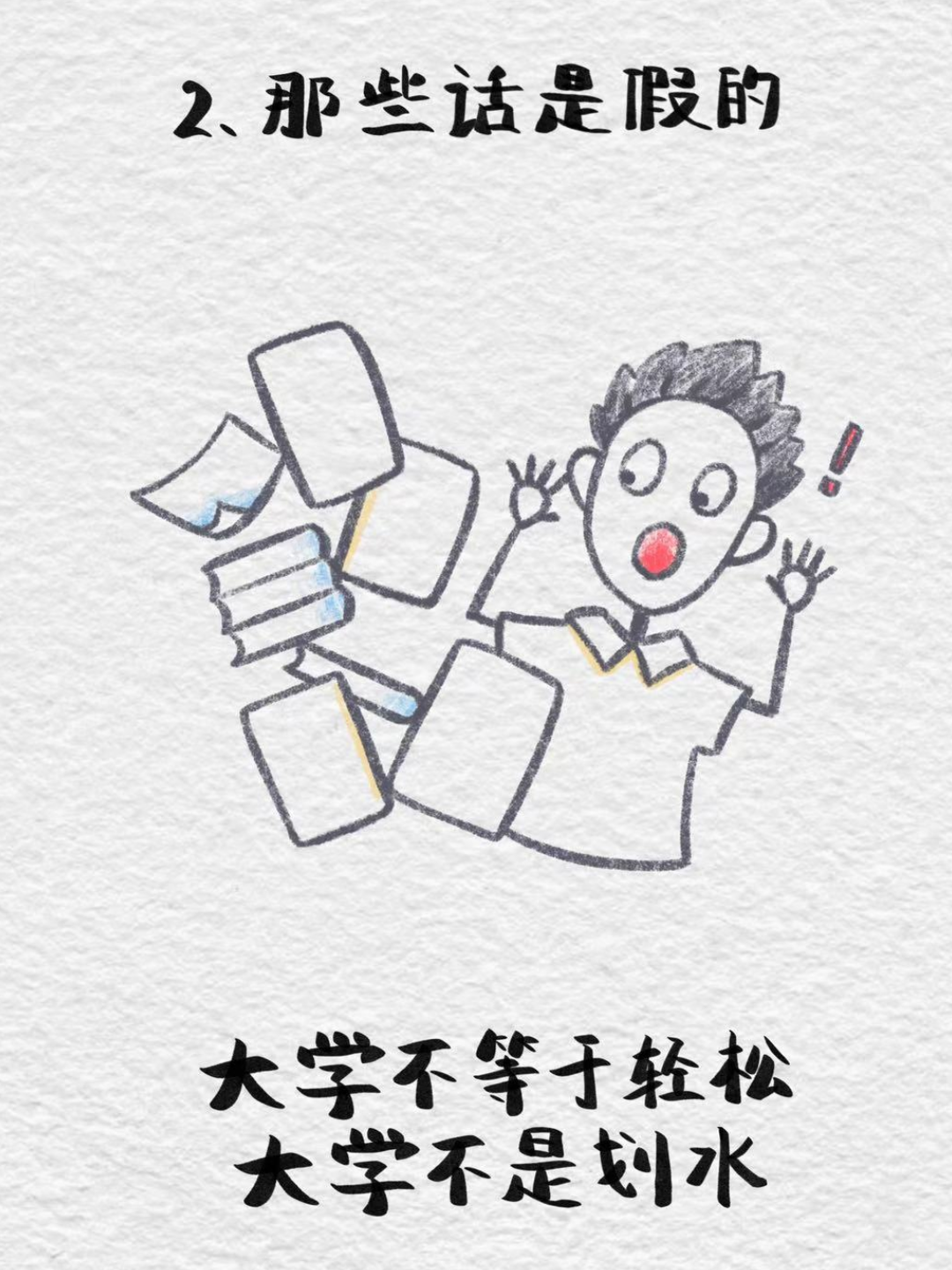 2.那些话是假的。在高中漫长而艰苦的复习过程中,你们无数次听到老师与家长对你说:“这段时间努力一把,上大学就好了。大学生活很轻松📒,你想做什么就做什么🩴🐷。上大学了🫘🤽🏽,你就可以彻底解放了💁🏻♂️。上大学了就不用那么拼命了。”刚上大学时还会有学长、学姐跟你说👱🏼♀️:“60分万岁👨❤️💋👨,期末考试都有重点,准备几天就过了。某某专业没前途,赶快转专业或者准备考专升本🪫。大学知识没有用🤽🏼,毕业都用不上。”等等。要切记这些都不可轻信。