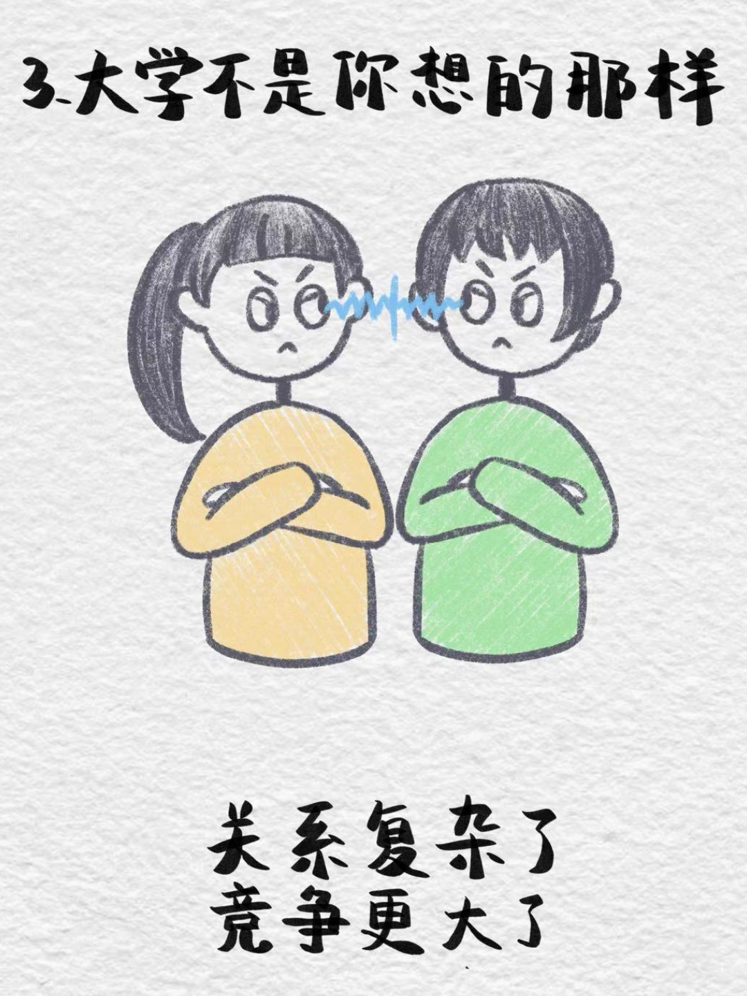 3.大学不是你想象中的那样🛥。通过高考进入大学,是所有学子的梦想。在拿到大学通知书的时候,很多同学都会展望自己美好的大学生活,抱着憧憬,抱着理想,甚至做好了各种攻略🧓🏿。可是到了大学才发现,理想和现实原来有着天壤之别。有些人开始怀疑自己是不是上了一个“假大学”?学习更辛苦了,要学习的东西更多了,竞争压力更大了,人际关系更复杂了⛹🏻♀️,事情都要自己做了🪄,所有的一切似乎都和自己的感觉不一样⚄。