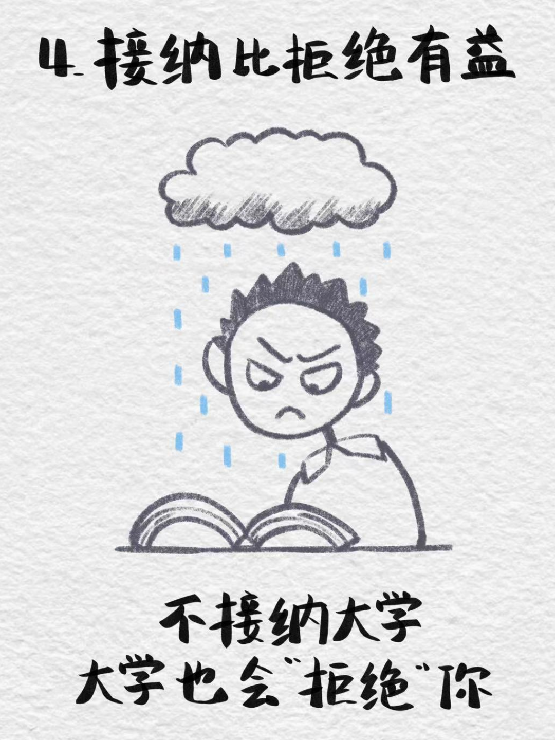 4.接纳比拒绝有益🤌🏿。也许你是经过专业调剂入学的🧝🏿♀️,或对这个专业根本不了解,抑或是专业由父母填报的,或者你高考没考好而被迫选择了这所学校♛。此时的你心理可能不接纳,甚至是“拒绝”的🚵🏽♀️,但如果长此以往,大学也将“拒绝”你。要知道🏄🏽,如果你没有回去复读的信心👩🏻🏭,这时候接纳比拒绝有益。