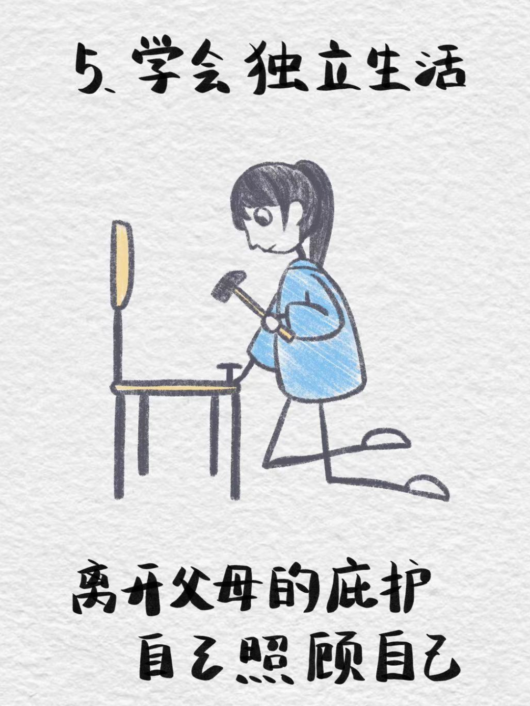 5.学着独立生活。也许曾经的你一直在父母的庇护下生活,这是你第一次住集体宿舍🎥。来到大学,你应该尽快熟悉大学生活的作息,独立整理自己的内务,独立照顾自己👲🏼,独立完成大学生活中的各项事务,这与有父母在身边的生活有很大不同,你不可再期待事事都有人帮忙,你应该学着长大。