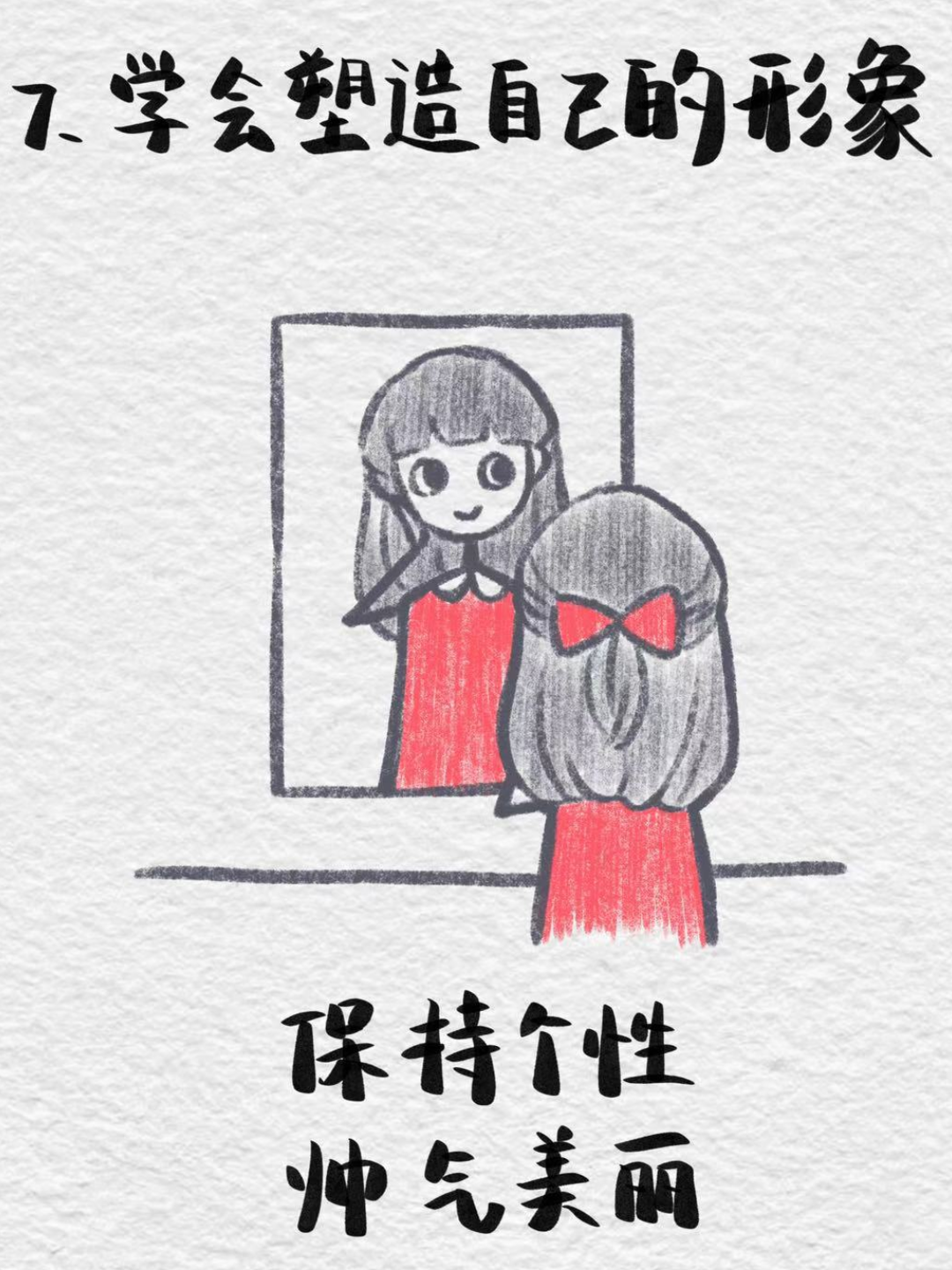 7.学会塑造自己的形象。上大学后,在不影响别人的前提下,你要有自己的个性,能坚持自己的价值观,同时保持开放。要打理好自己的容貌和形象,没有人会愿意透过你邋遢的外表去发现你美好的心灵,但是不必过分追求,只要干净👩🏼🏫🐈⬛、整洁✷、有自己的风格就好;男生😉,你长的可以不帅♘,但你可以成为帅气的男孩🧑🏿🏭🐶。女生,你长的可以不漂亮,但你可以成为美丽的女孩。