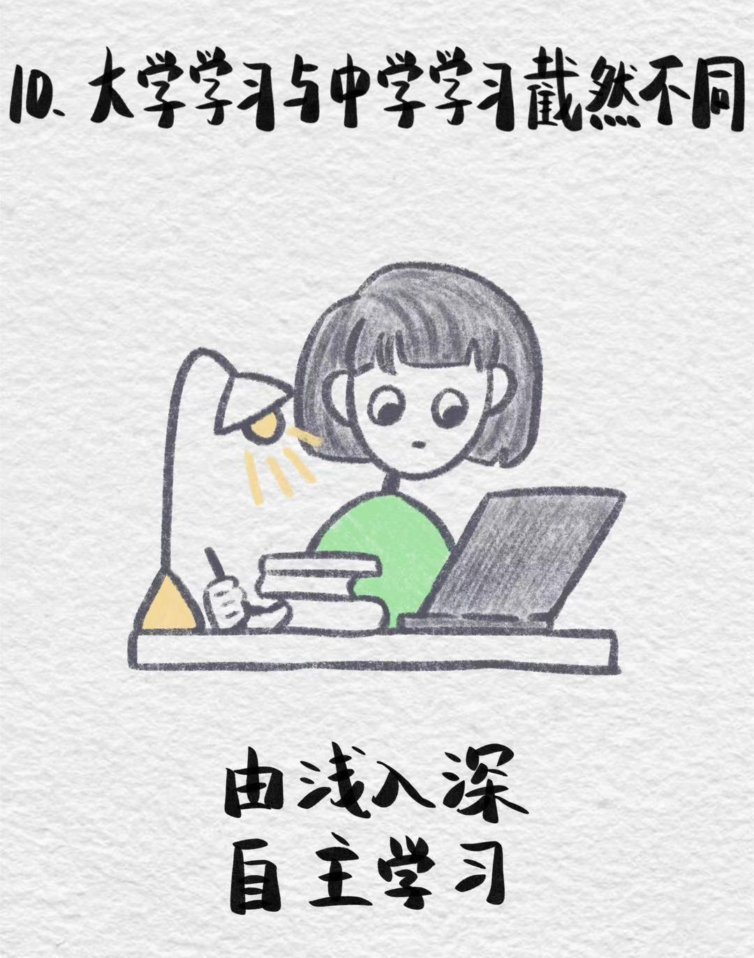 10.大学学习与中学学习截然不同。在学习目标上,已从考上大学转变为如何使自己成为综合素质优秀的高级人才;在学习要求上,不仅仅局限在得高分上🎯,更多的是充分掌握专业知识与能力,培养全面素质🍈;在学习的自主性上,中学生主要依靠教师安排学习活动👩🏼⚖️,自主性较低👩🏿🏫,大学生则主要靠自己安排学习活动🔘,自主学习范围大;从所学内容来看,中学少而浅👩🏽🎤💃🏿,大学多而深🕵🏽。