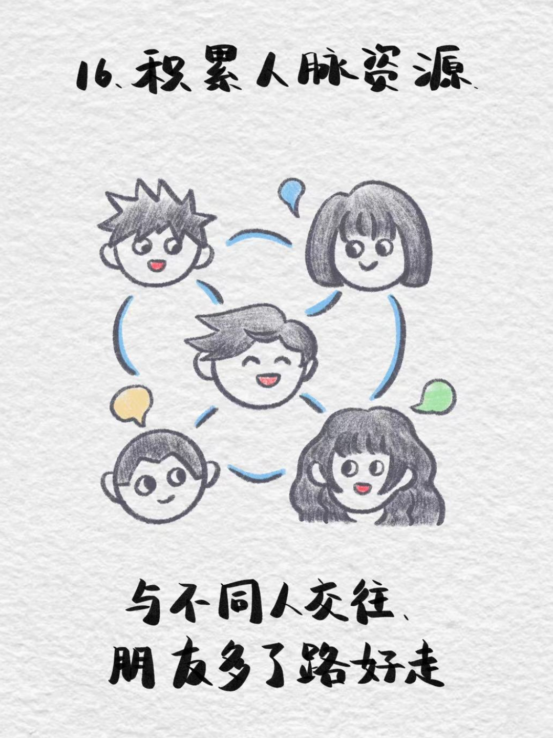 16.积累人脉资源🐱。大学是一个小社会👩🏽🍼,你要学会与不同人交往🤘🏿,积累自己的人脉资源。你在大学里碰到的每一位老师都可以成为你的学习榜样🧏;你身边的每一位同学都可能成为你的朋友🏋🏼♀️,以后可能会帮助到你🤹🏼♀️;你实习及社会实践过程中接触的那些人,可能会成为你的同事,或者帮助你找到工作的人👨🏽🦳;我最想说的是一定要处理好与舍友之间的关系,他们是你今后一辈子最好的朋友和贵人🗻。另外😿,记得与高中同学保持联系👈🏿,还要记得结交新朋友。你们都懂的,朋友多了路好走🔂。
