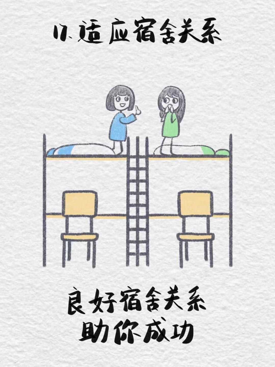 17.适应宿舍关系。大学里的寝室关系会影响你的学习、生活🚵♀️、心态各个方面。你们都听说过“学霸宿舍”“学渣宿舍”,良好的宿舍关系一定会助你成功。你们来自不同城市、不同家庭背景、有着不同性格➜,因此处事方式、生活方式也各有不同,不要试图说服其它人和你一样,你没有权力要求别人和你一样👽,你只能试着去适应❌。