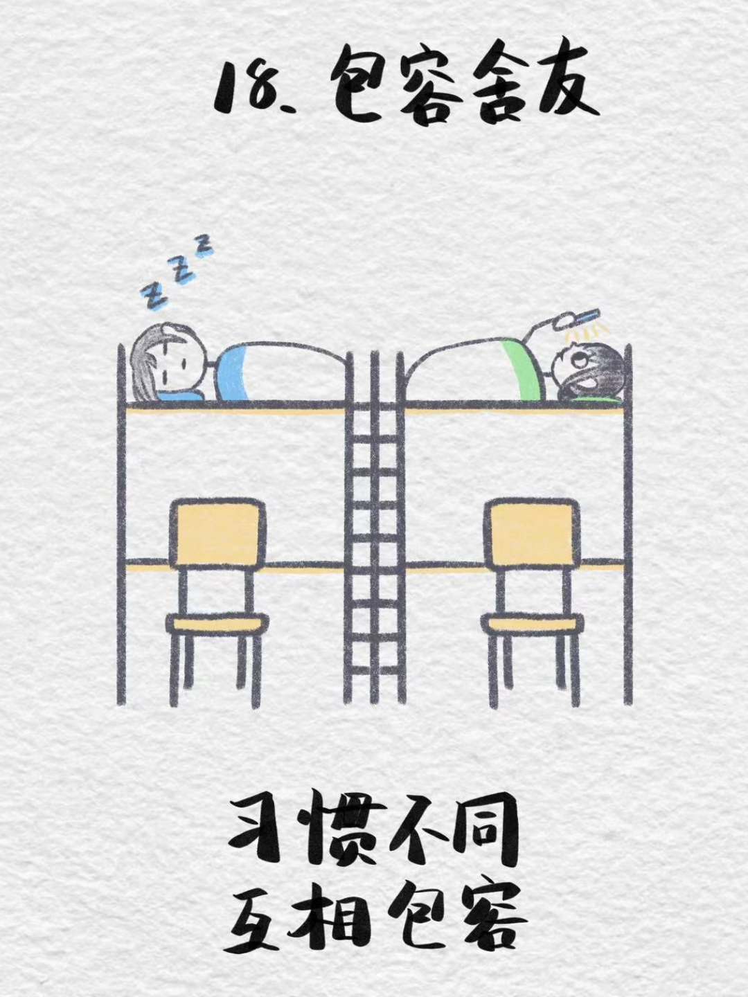18.包容舍友🍢🦊。要学会和你生活习惯完全不同的室友一起生活,不会刚好一个宿舍的所有人都有一样的睡眠模式🙎♀️,学习习惯以及卫生要求♒️,这时候你能做的只能是互相包容🟠。学着和他们成为朋友💆🏿♀️。有的人是不太会考虑别人的感受,不过大部分时候,你的室友也是这样评价你的🧓。最后这些室友会成为你难忘的校友。
