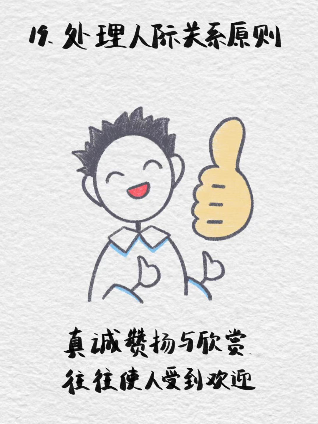 19.处理人际关系的原则🏊🏼♀️。良好人际关系能提高学习效率、完善自我意识、促进心理健康。坚持真诚待人、宽容待人🔱、平等待人原则。交往中不要总是批评🤏🏼、指责别人,而应真诚地赞扬和欣赏别人🍋🟩。与人交谈时🚛,要善于倾听🦇,少说多听🧑🏿🍼🧣,这样的你一定会受到欢迎。