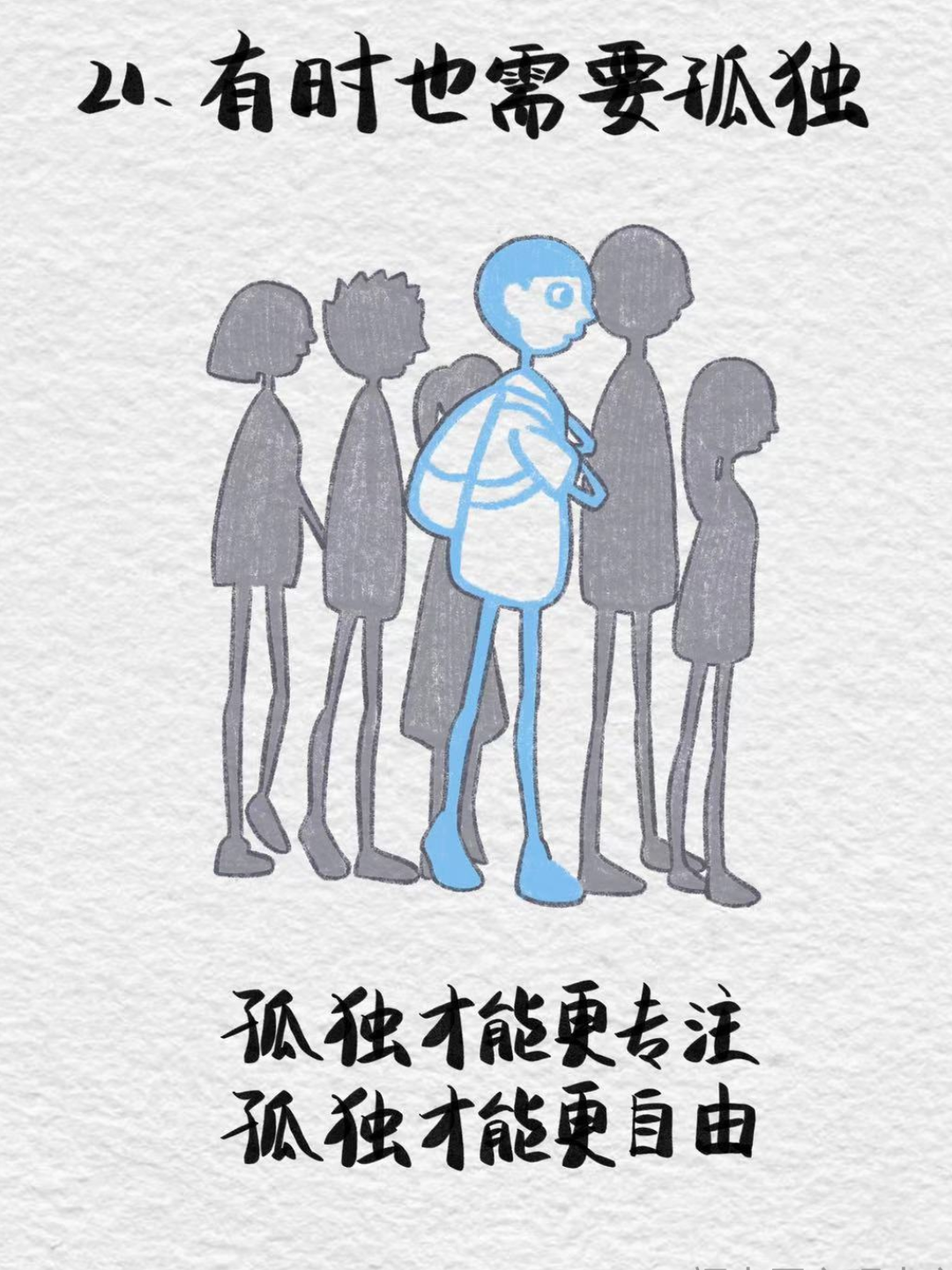 21.有时候也需要孤独♔。如果你发现自己很长时间都是一个人去食堂吃饭或者去上自习,别在意👩🏽🎨,大学里一个人是正常的🏮,你觉得孤独?或许你就喜欢这样,孤独的你才能更专注⚫️,才能更自由🧆🫱,只要你自己觉得过得很充实,感觉到幸福快乐就不需在意别人的眼光。