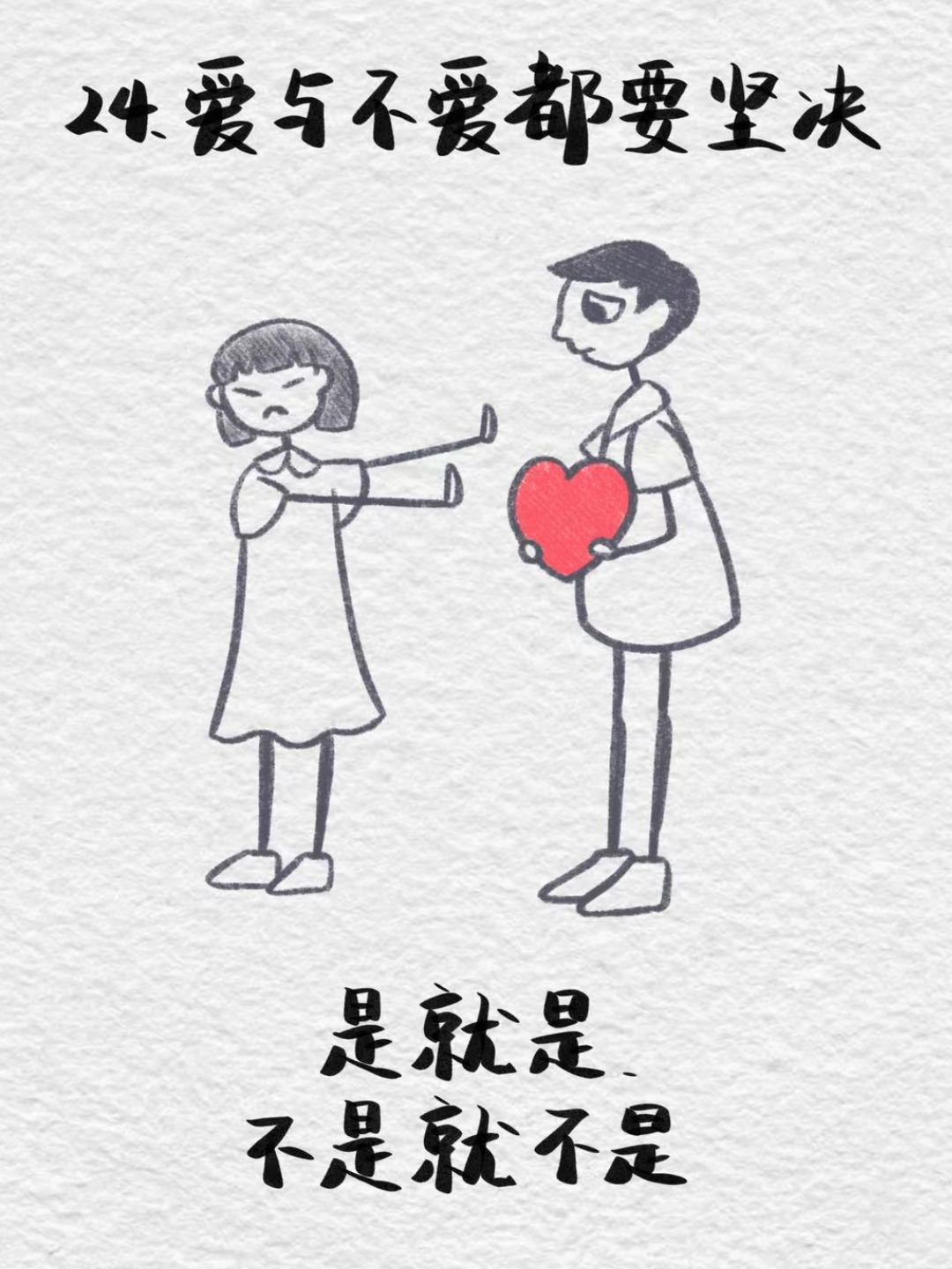 24.爱与不爱都要坚决。如果爱就勇敢说😠,如果不爱就坚决拒绝🪐。如果你很了解他(她)🐃,也真心喜欢他(她),就勇敢地告诉他(她)👨🏼🚒,追求你真正爱的人,只要自己认为值得,那就是值得的。“我爱你”这句话别对很多人说,希望你可以把这句话说给你心中真正最爱也最值得的人🧎➡️,这是尊重你爱的人👂🏿,更是尊重你自己的感情。拒绝爱要坚决,爱你的人,向你表白时🤦🏿,不管你接不接受,你都应该感谢对方,这是对他们的尊重🚴🏻♂️。如果你不爱他🦕,他又向你表白了🌽,一定要肯定回答,是就是👖,不是就不是,不可以模棱两可,给予他人盲目的希望👨👩👦🧑🦰。如果恋爱过程中,你看清了一个人🏖,请你学会及时止损,勇敢的说再见👩🏻🏫。