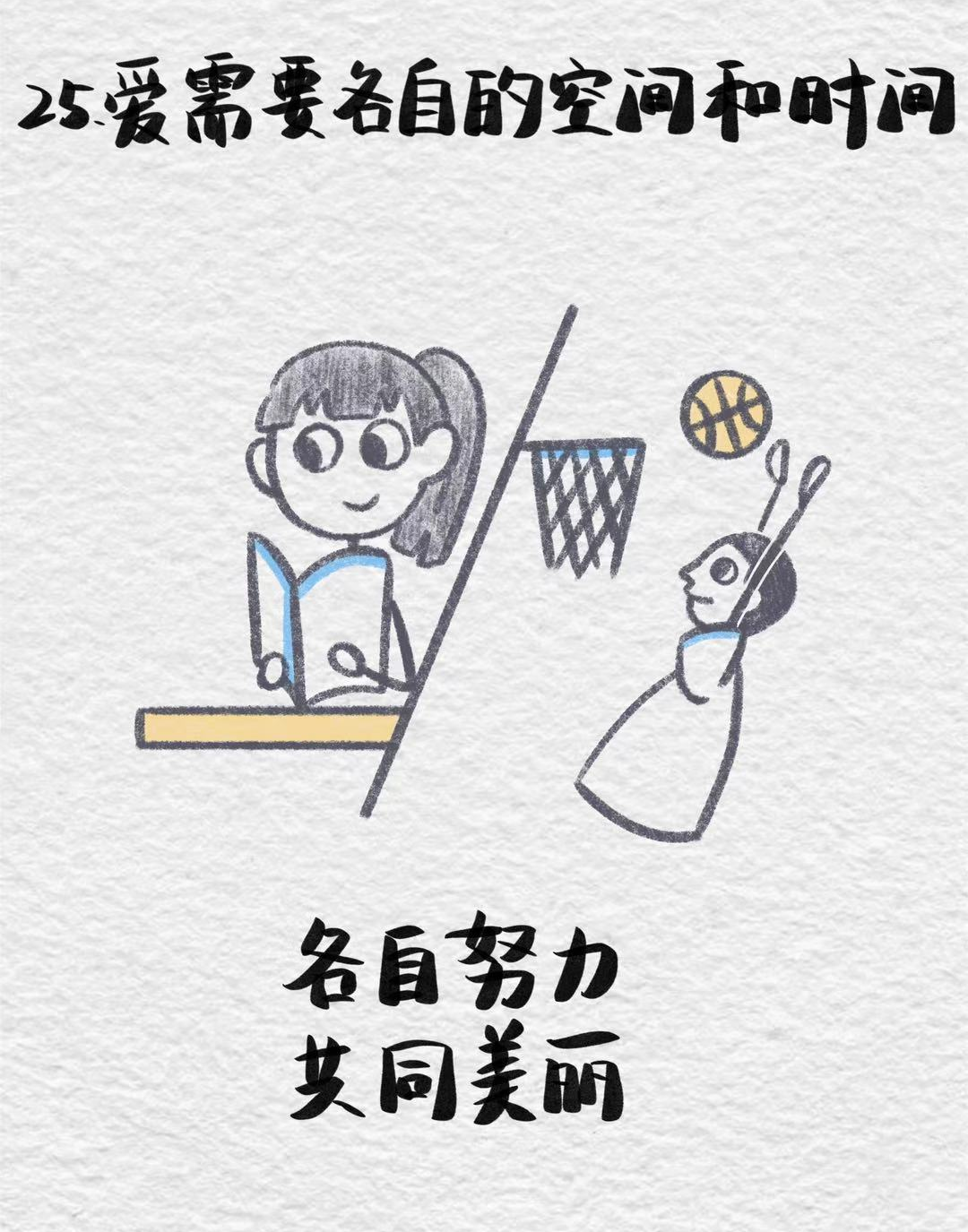 25.爱需要各自的空间和时间。不要觉得恋爱后一定要天天黏在一起,不要觉得天天在一起秀恩爱别人会羡慕你。更不要在教室、图书馆、食堂等公共场合秀恩爱,这样只会让人觉得你不懂事。给予对方更多时间和空间去做该做的事情。甚至鼓励对方多与不同人交往,多参加更有意义的活动🤷🏻♂️。要知道,你控制得越紧,对方跑得越快🧥。还有就是你们懂得的😏,天天在一起哪还有新鲜感。其实,我最想表达的意思是🍞🍨:你们恋爱,各自努力🎲🧑🏻🚀,各自有自己的人际圈子🌽,互相督促🟩🏦,积极上进。