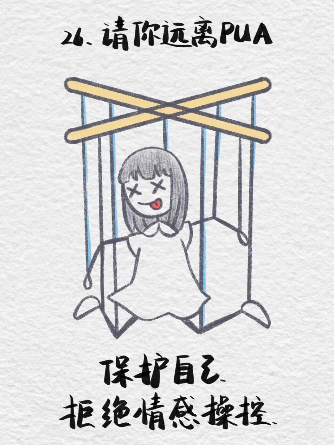 26.请你远离PUA。大学生一定要认真考察自己的恋爱对象,只要你发现你们之间的恋爱关系不平等,经常感觉到低自尊,没有自己的想法☘️,也感受不到快乐🙍🏻♀️,好像陷入了情感操控👷♂️,请你立即“撤退、远离”,这是保护你自己的最好方式。