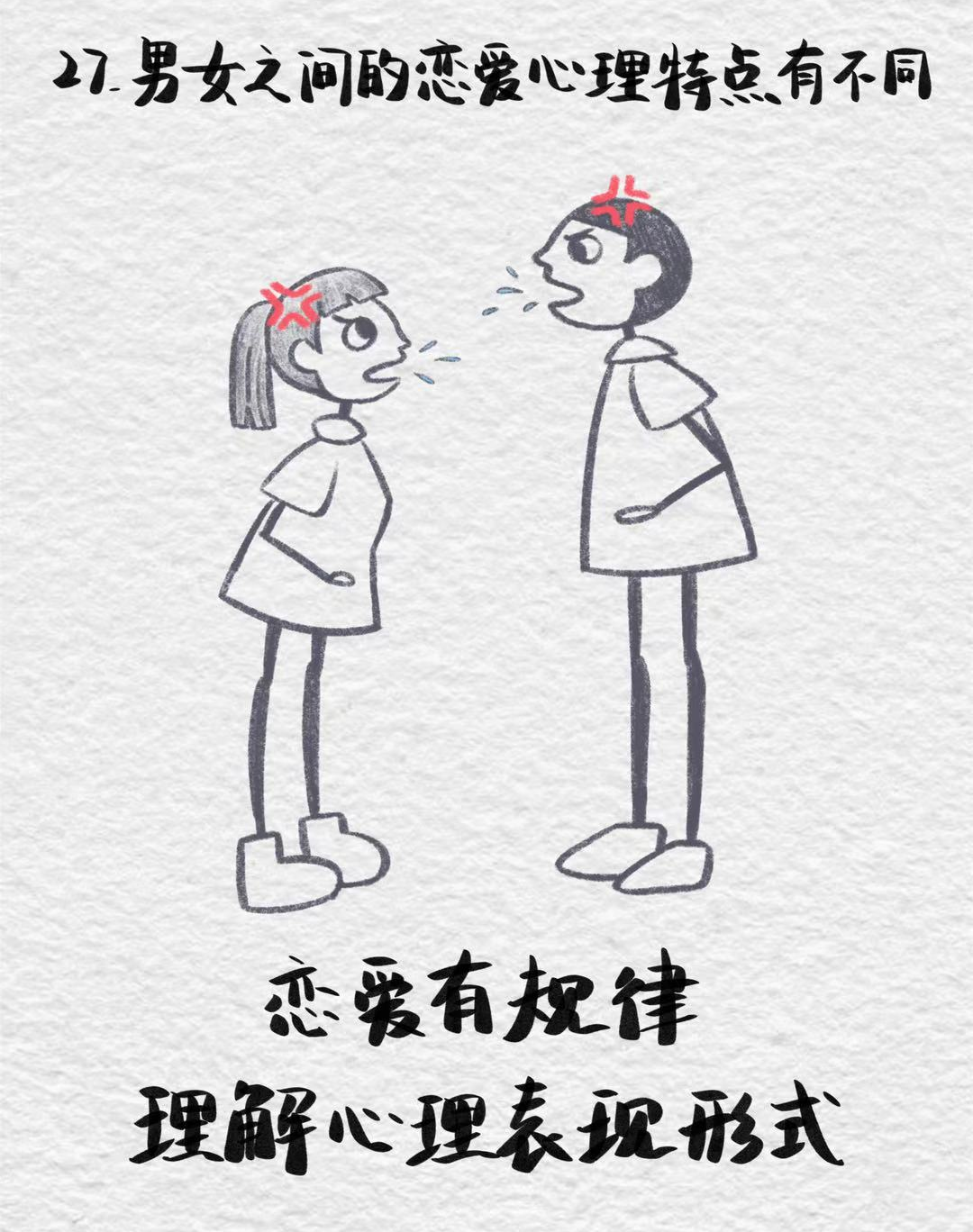 27.男女之间的恋爱心理特点是不一样的。很多同学不懂恋爱规律✯,对男女之间恋爱的心理特点不了解👩🏿💼,对恋爱双方的心理需求不理解👰🏽♀️,对恋爱双方出现的特殊心理表现形式不理解,不能正确看待交往中出现的种种心理现象,甚至产生很多误解🧑🏿🚒。这时候建议同学们多看看书,多多了解男女之间的心理特点🫳🏽🤕。