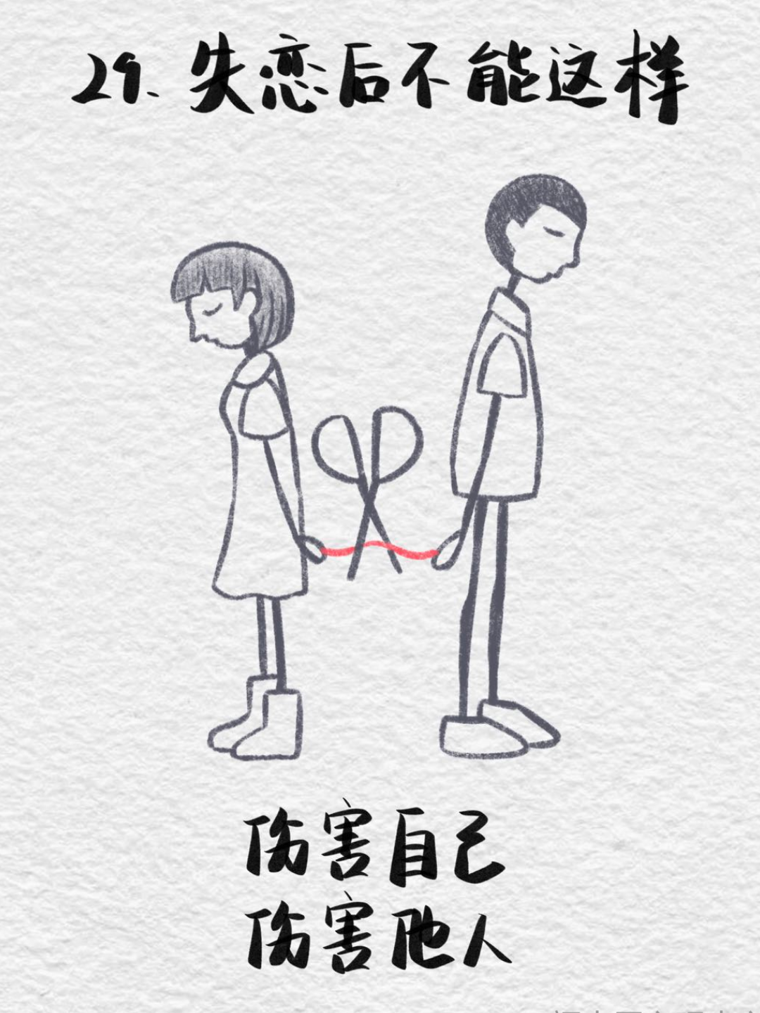 29.失恋后不能这样😧。记得哦🙆🏼,失恋后最好不要继续做朋友,如果继续做朋友会带有很多情愫,恋爱就会分得不彻底,痛苦就会被延长。不能自暴自弃,更不能伤害自己,不能报复和伤害别人,也不能马上找个替代的人来安慰自己受伤的心灵。