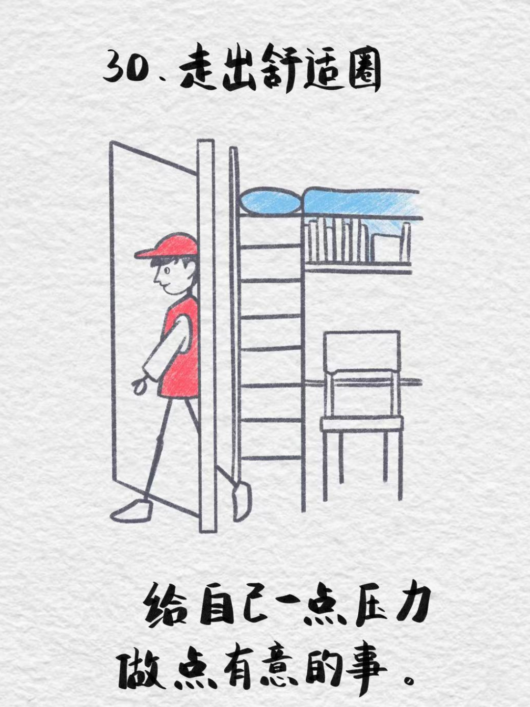 30.走出舒适圈。上大学是踏出舒适圈的好时机,在家受到各种“诱惑”无法收心,无法自律,请同学们上大学后尽快走出舒适圈。不要等到期末了才想起要读书💨,不要等到生病了才想起要锻炼身体🚶♀️,不要等到你身边的同学一个个都变优秀你才想起要去锻炼能力,不要等到大家都准备考研了你还在思考要不要考研。走出自己的舒适圈吧,给自己一些压力🍄🟫,做点有意义的事情,图书馆、运动场、活动现场你应该常去。